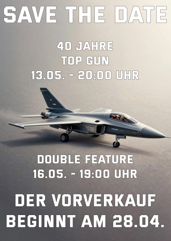 Wir beginnen den Abend mit dem Original Top Gun In der Pause bereiten wir euch unsere beliebte Currywurst (auch in vegetarisch) vor, natürlich mit unserer Soße nach Geheimrezept, dazu Pommes und ein Bier oder Softdrink. Anschließend geht es weiter mit Top Gun Maverick. Auch hier wieder mit realen Flugszenen und aufregender Action.